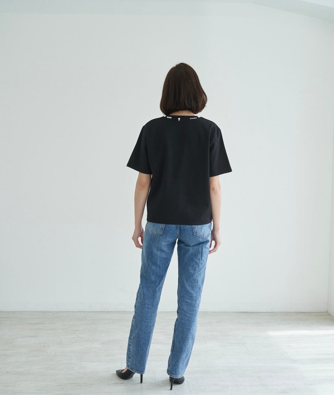 ランダムパール付きTシャツは、首回りにあしらったパールが華やかな印象を与えるアイテムです。